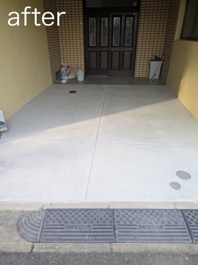 施工前はタイル張りの土間でひび割れがあり、勾配が悪く雨水がたまっていましたが、再度勾配をつけ、ひび割れ防止の為に伸縮目地を入れて生コン打ちシンプルに仕上げました。雨水が溜まるのが解消されました。